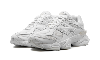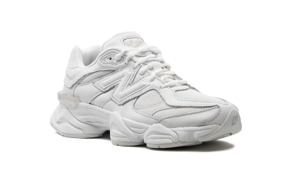 Discover clean, modern style with the New Balance 9060 "Triple White." This sought-after shoe, popularized by designer Joe Freshgoods, offers a fresh take on classic New Balance design. Featuring a white mesh base and tonal suede and leather overlays, it delivers a monochromatic look. A white "N" logo and "NB 9060" tongue detailing complete this stylish and versatile sneaker.
