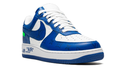 The Louis Vuitton x Nike Air Force 1 Low “White/Blue” is a special collaboration between the storied high fashion house and Nike that was directed by the late Virgil Abloh. One of multiple colorways of the Air Force 1 produced by Louis Vuitton, Nike, and Abloh in 2022, the “White/Blue” features a two-tone color block of white and blue that mimics the styling of original Nike Dunk colorways from 1985. The shoe’s white leather base features Louis Vuitton’s famous monogram print stamped into the material. A contrasting blue textile with the Parisian fashion brand’s aforementioned pattern is found on the overlays and Swoosh. Signature details from Abloh’s previous collaborations with Nike under his Off-White clothing brand include a green hang tag on the sides, and printed “AIR” branding alongside classic Air Force 1 “AIR” detailing on the lateral side of the midsole. Virgil Abloh - White/Blue