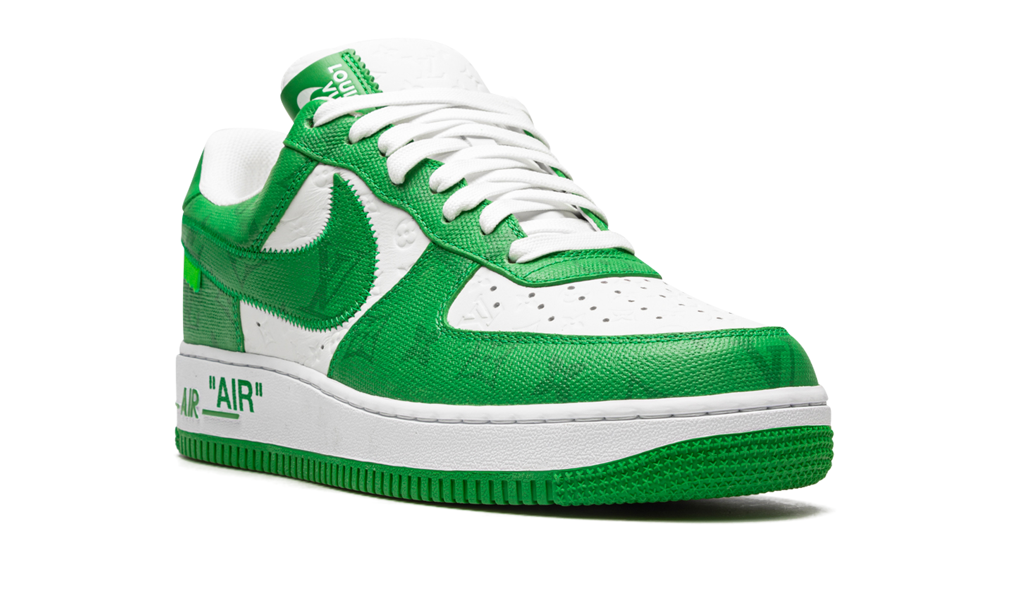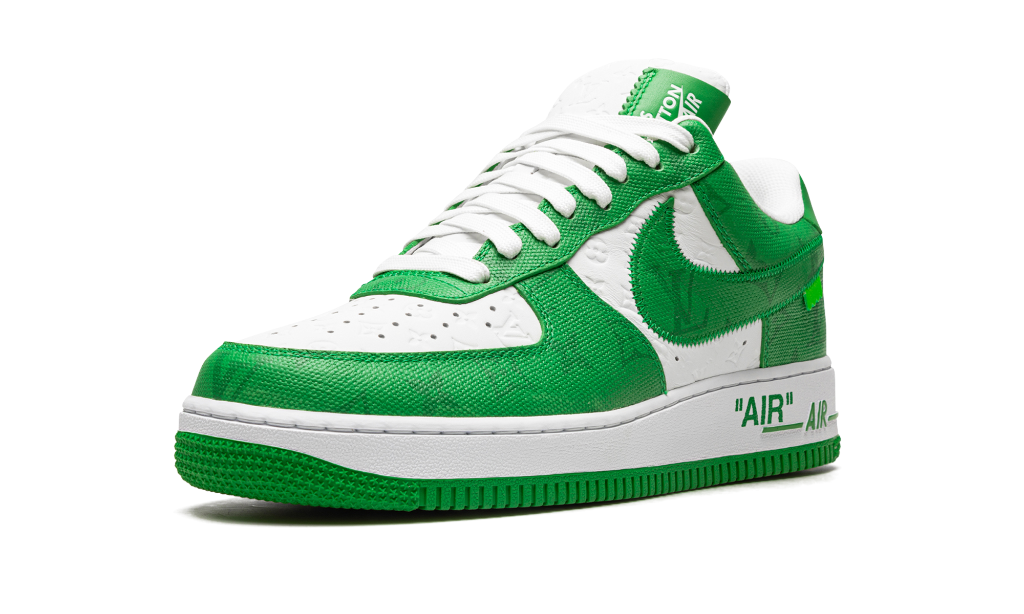 The Louis Vuitton x Nike Air Force 1 Low “White/Green” is a special collaboration between the storied high fashion house and Nike that was directed by the late Virgil Abloh. Produced by Louis Vuitton, Nike, and Abloh in 2022, the “White/Green” features a two-tone color block of white and green that replicates the color block of original Nike Dunk colorways from 1985. This highly sought after collaboration for the Air Force 1 features a white leather base with Louis Vuitton’s famous monogram print stamped into the material. A contrasting green textile with the Parisian fashion brand’s aforementioned pattern is found on the overlays and Swoosh. Signature details from Abloh’s previous collaborations with Nike under his Off-White clothing brand include a lime green hang tag on the sides, and printed “AIR” branding alongside classic Air Force 1 “AIR” detailing on the lateral side of the midsole. Virgil Abloh - White/Green
