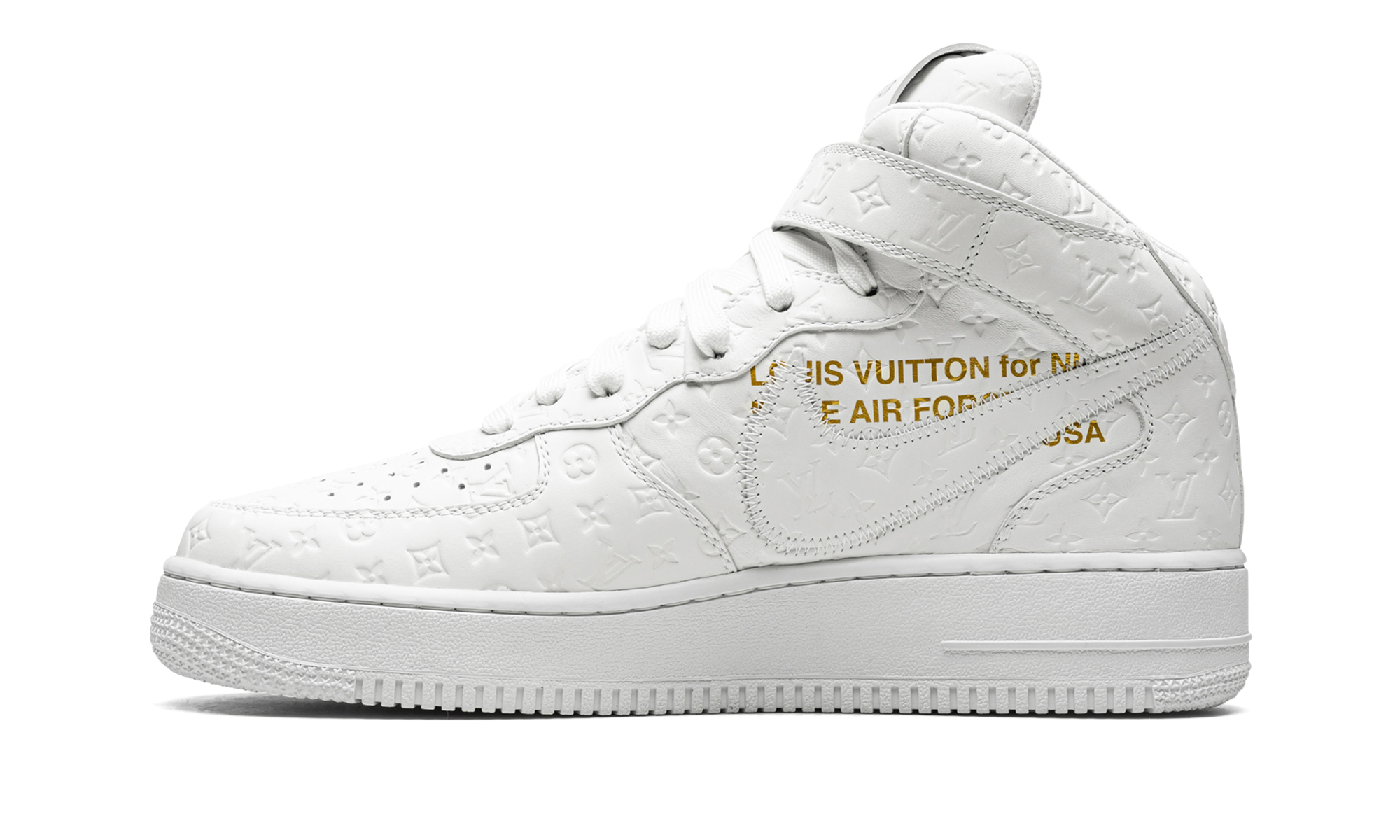 The Louis Vuitton x Nike Air Force 1 Mid “Triple White” is the coveted monochromatic white colorway included in the collaboration by the storied high fashion brand that was directed by the late Virgil Abloh. The “Triple White” is one of multiple colorways of the Air Force 1 produced by Louis Vuitton, Nike, and Abloh in 2022, and one of the most desirable releases of the year, as well. As for the shoe’s design, it features a monochromatic white leather upper with Louis Vuitton’s famous monogram print stamped into the material. A stitched Swoosh outline appears on either side of the shoe. Other design elements include a reworked “Louis Vuitton Air Force 1” logo on the side of the tongue and a white tab on the lateral side of the Swoosh on the mid-panel. The shoe rides on a brown rubber sole. Made in Italy. Virgil Abloh - White/White