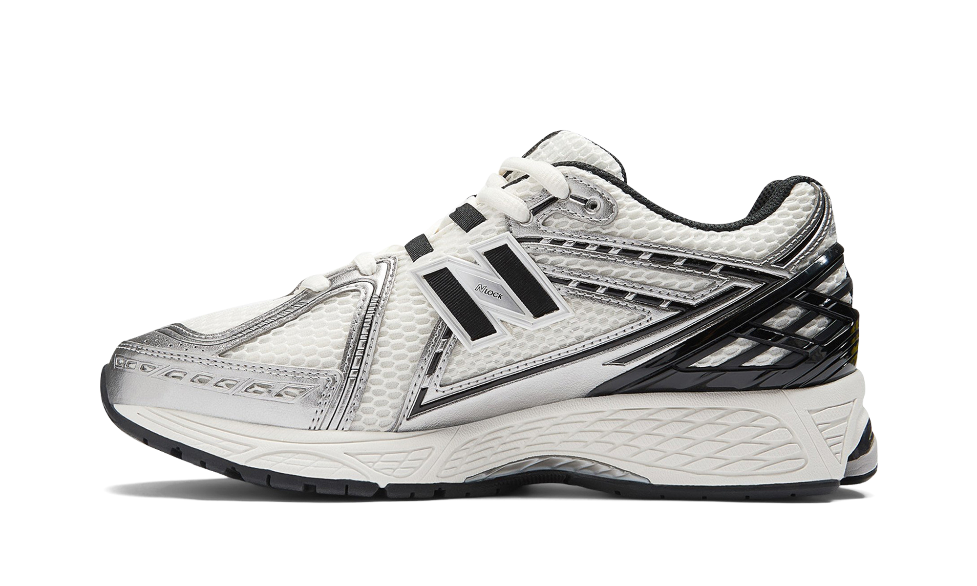 Discover the versatile New Balance 1906R "Metallic Silver/Black," a retro sneaker reimagined for today. Originally a performance running shoe, this style returned in the 2020s with a fresh appeal. It features a white mesh upper with striking Metallic Silver synthetic leather overlays accented in black. A black "N" logo adds a classic touch, while comfortable cushioning ensures all-day wear.