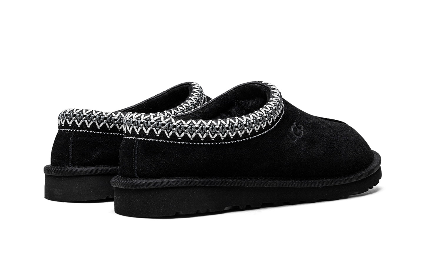 The Ugg Tasman “Black” is a mostly black colorway of the comfortable slip-on moccasin. Made for indoor or outdoor wear, the Ugg Tasman has a slipper-style design with a warm inner lining constructed of plush sheepskin and upcycled wool. The upper features a black suede construction with an embroidered braid with white accents around the collar. Uggs branding is seen on the lateral side. The black EVA foam sole has a traction pattern outsole for grip on a variety of surfaces.