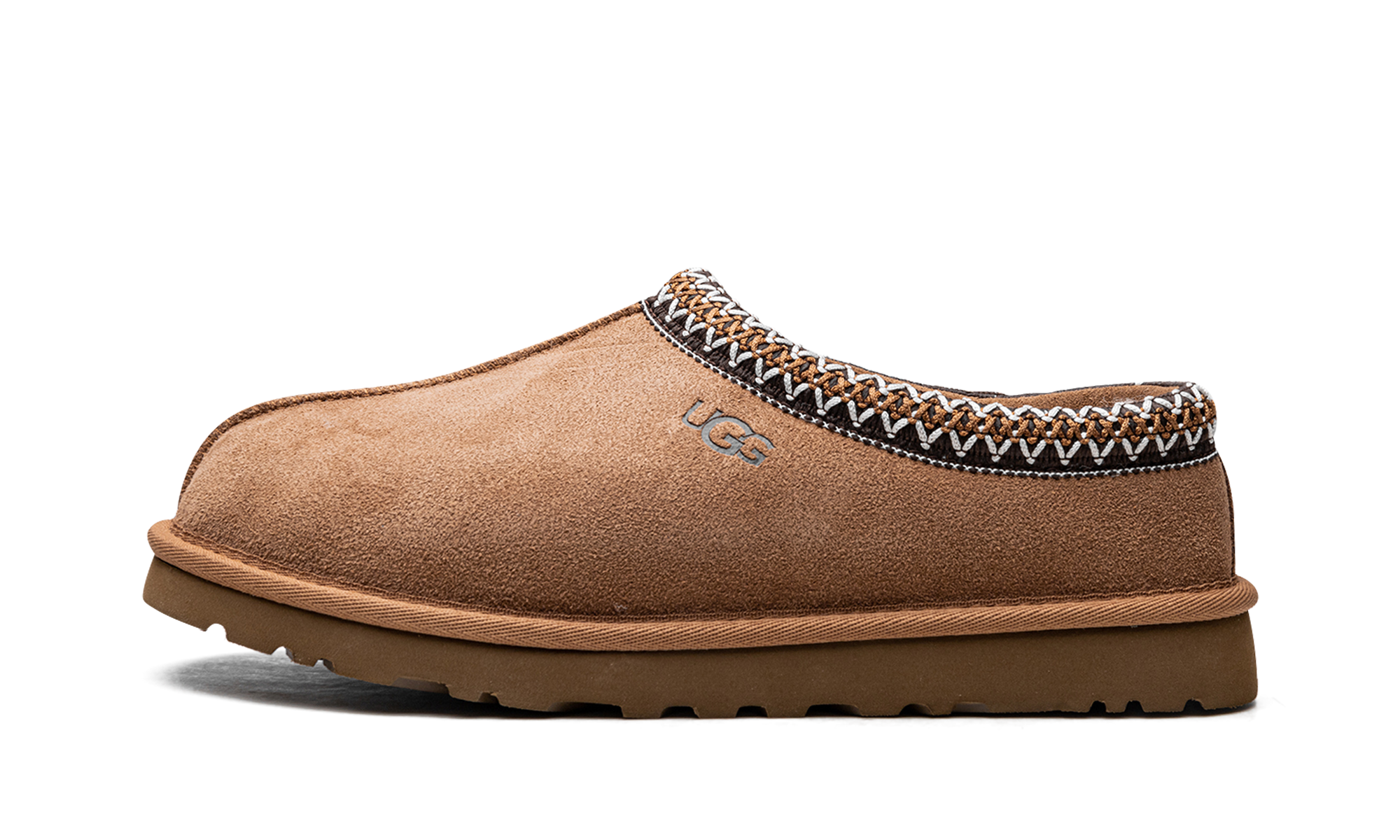 The Ugg Tasman “Chestnut” is a brown-based colorway of the comfortable, slip-on moccasin for men. Made for indoor or outdoor wear, the Ugg Tasman features slipper-like levels of comfort with an inner lining constructed of plush sheepskin and upcycled wool. The upper is made from Chestnut-colored suede. An embroidered braid appears around the collar. Uggs branding is found on the lateral side. Underfoot, a brown EVA foam sole has a traction pattern on the outsole that provides grip on a variety of surfaces.